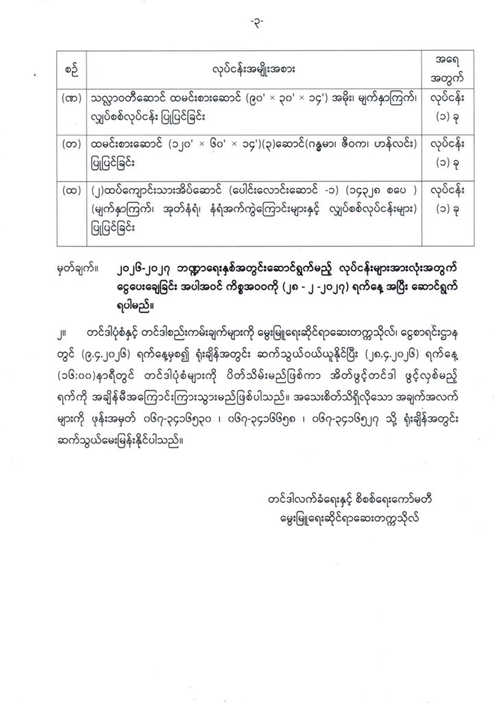၂၀၂၆-၂၀၂၇ ဘဏ္ဍာရေးနှစ်တွင်ဆောင်ရွက်မည့် တည်ဆောက်ရေးနှင့် အကြီးစားမွမ်းမံ ပြင်ဆင်ခြင်း လုပ်ငန်းများ အတွက်အိတ်ဖွင့် တင်ဒါခေါ်ယူခြင်း